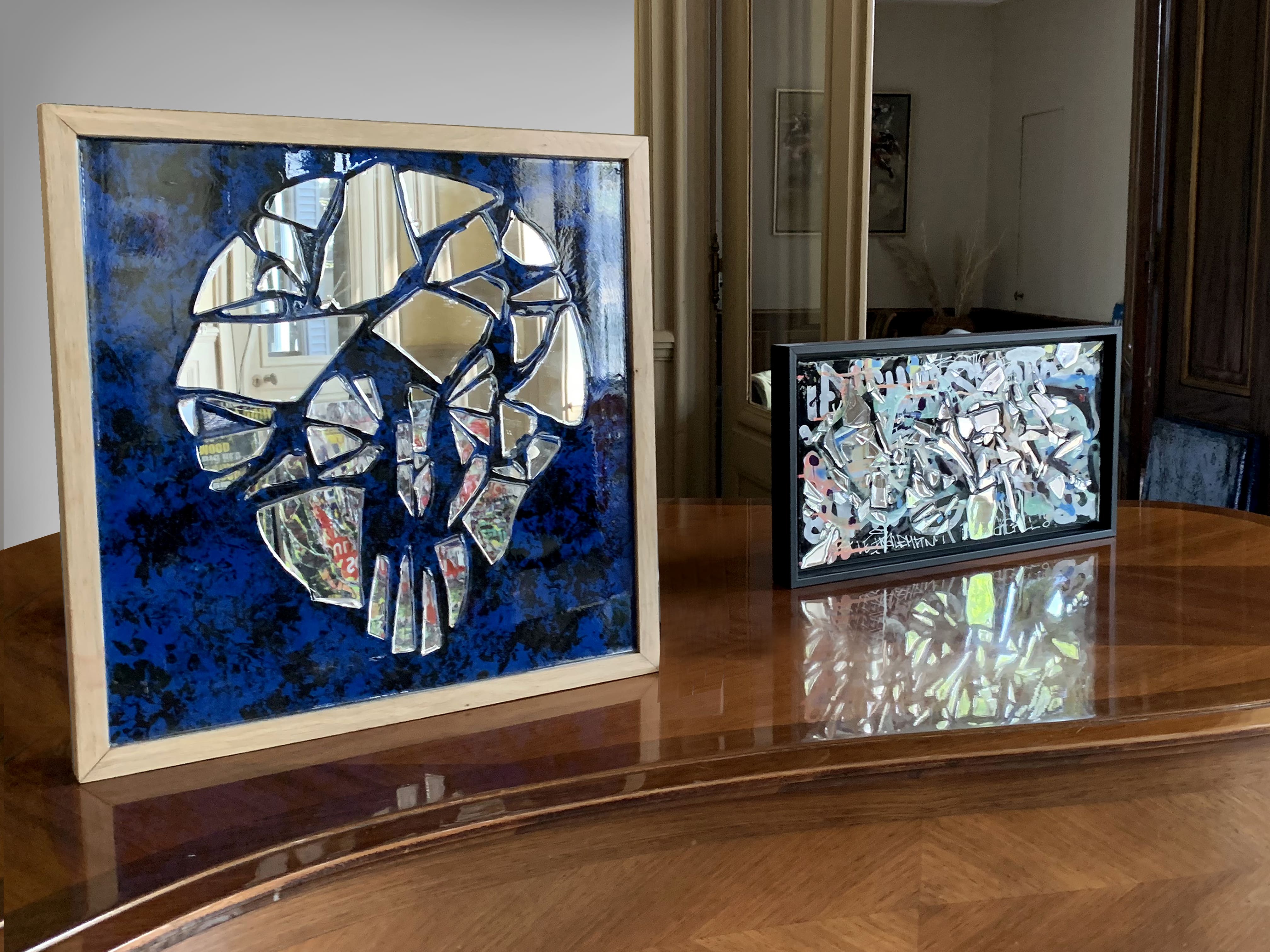 Assemblage de morceaux de miroirs figés dans une résine transparente, sur un support bois marbré d'acrylique bleu et noir, cadre en chêne blanc.