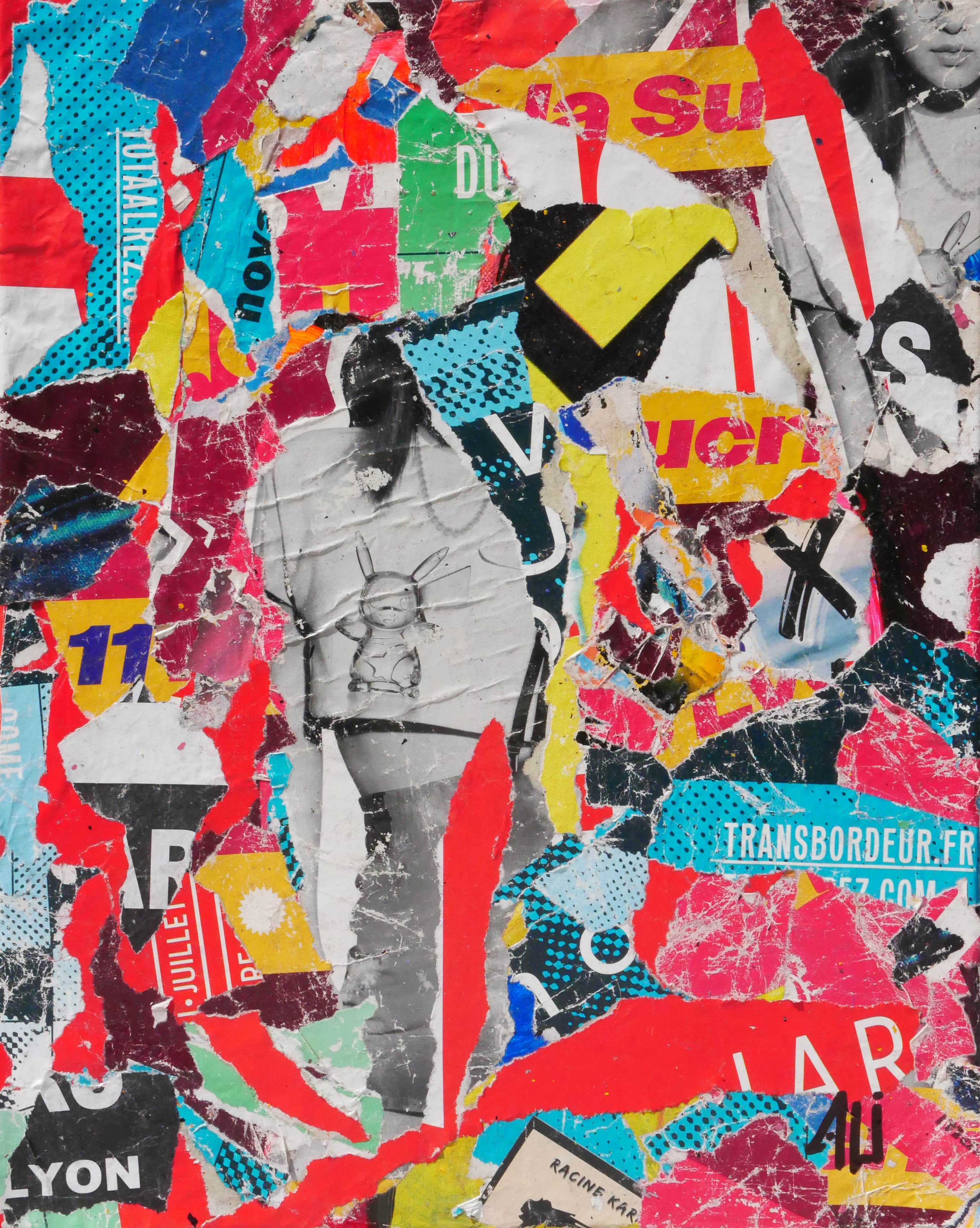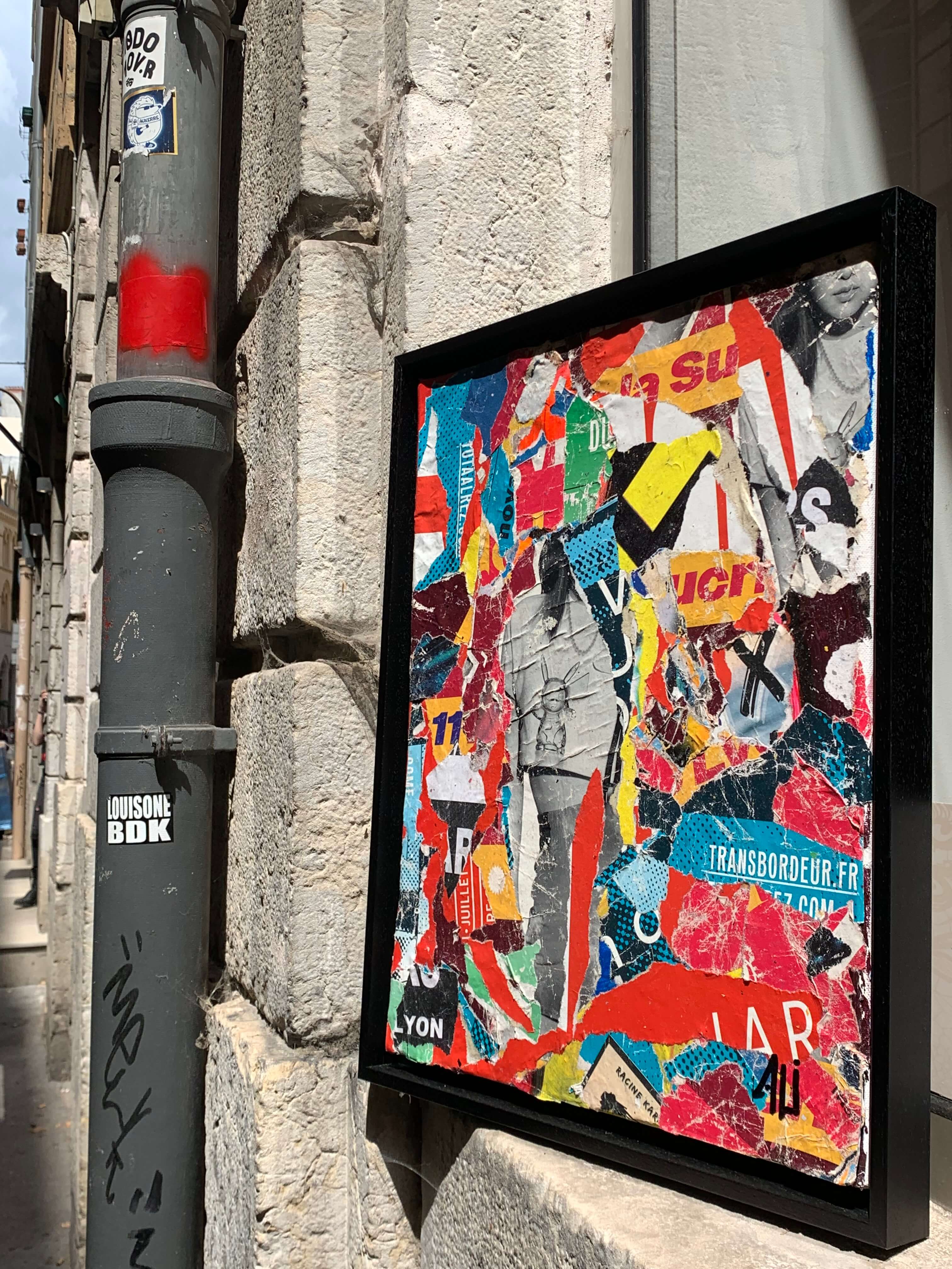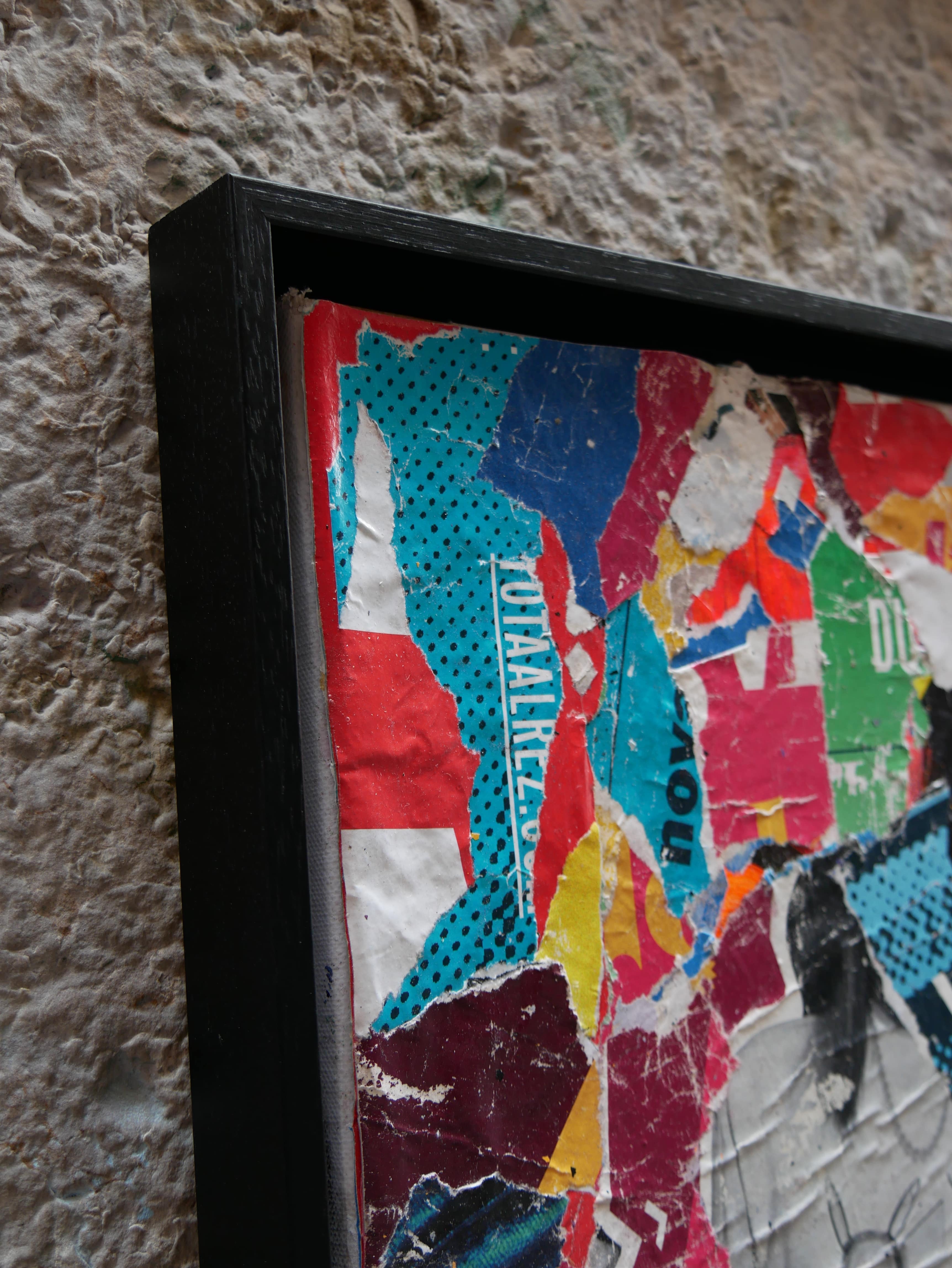 Collages de morceaux d'affiches déchirées. Finition vernis sur toile. Cadre en caisse américaine noir bois.