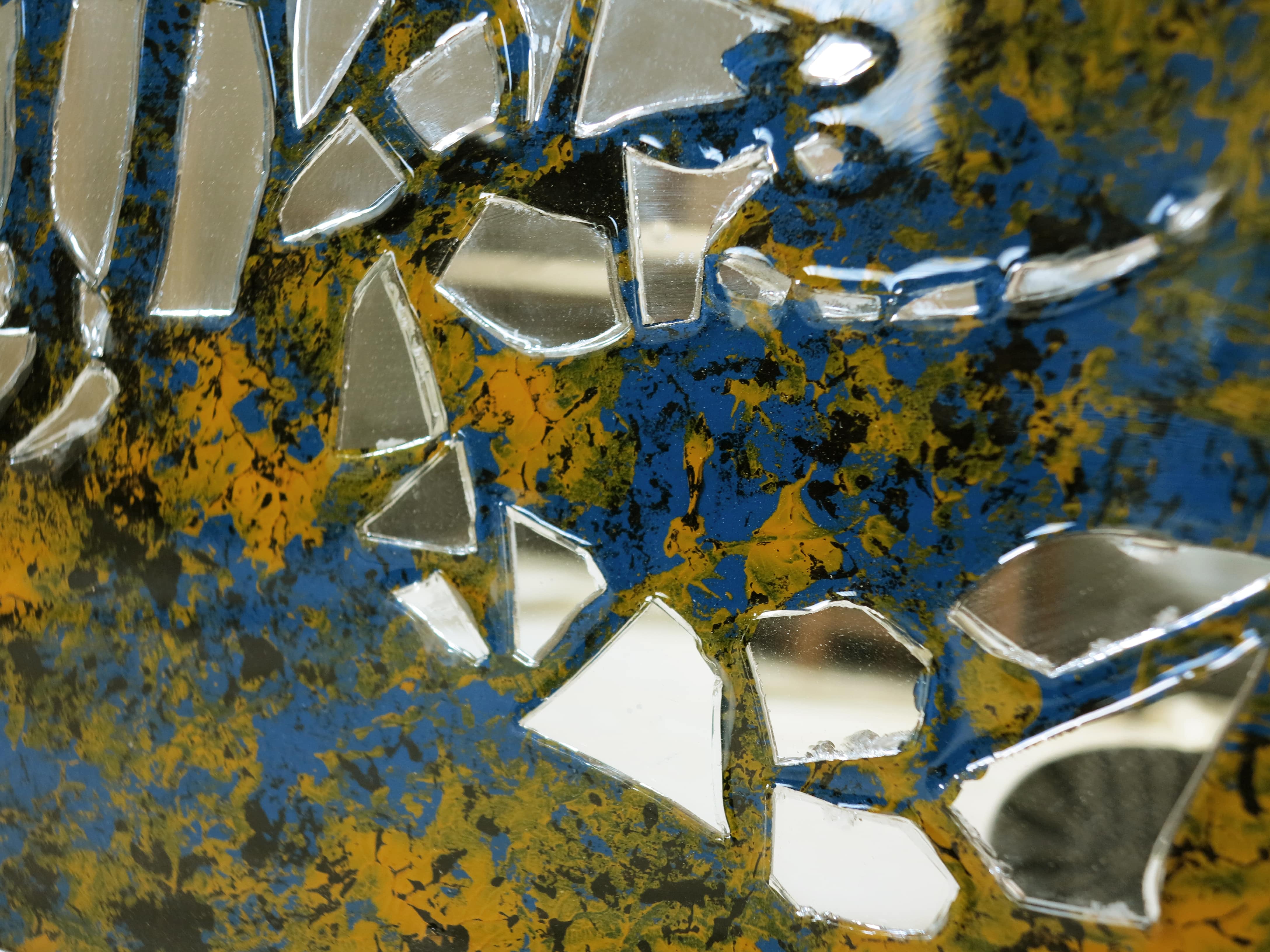 Mosaïque de miroirs, joint en résine, cadre en chêne blanc, support bois. Texture : peinture acrylique marbrée.